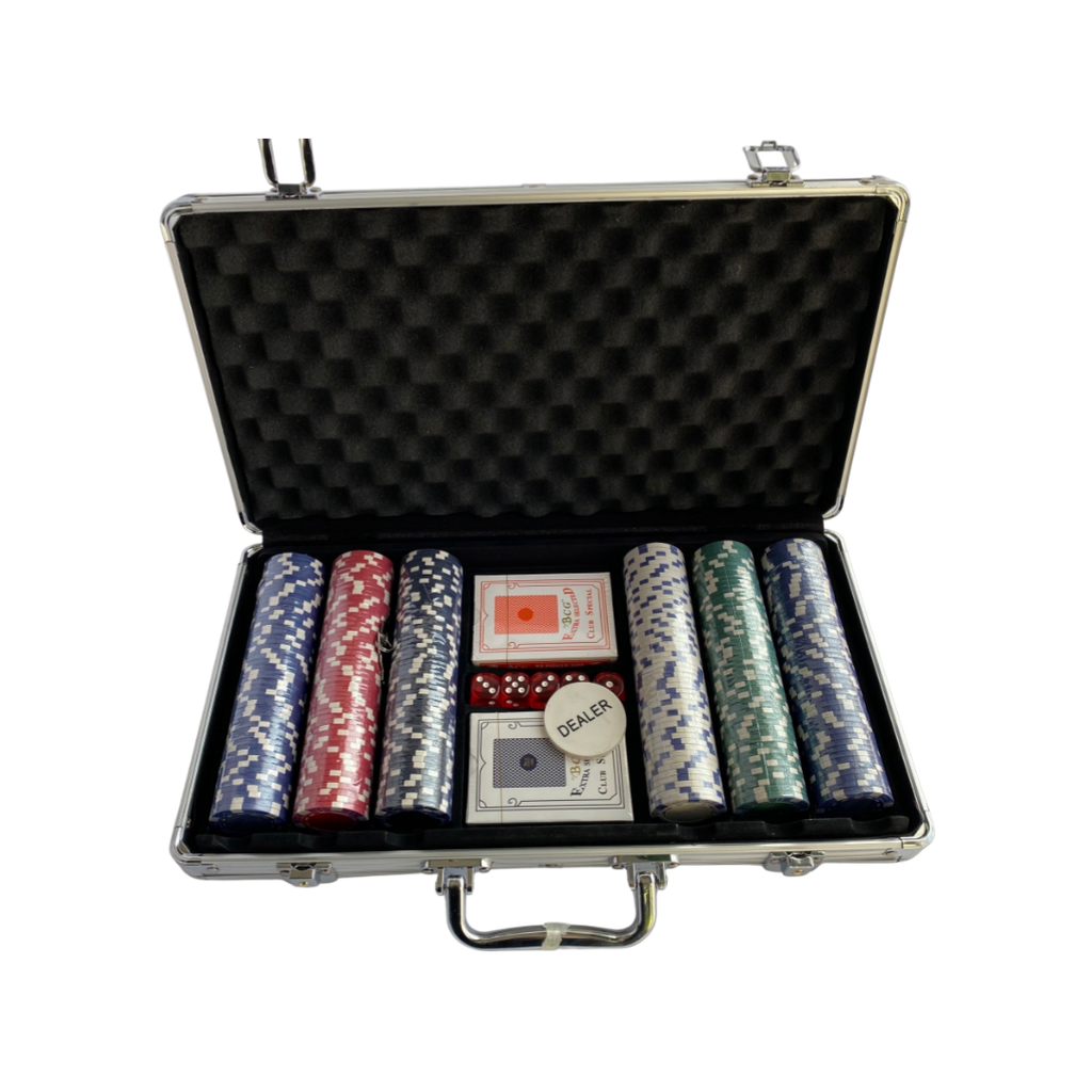 - Includes 300 Poker Chips, 1 Deck of Playing Cards, Dealer Button, 2 Betting Buttons, 5 Poker Dice, Aluminum Carry Case, Instructions
